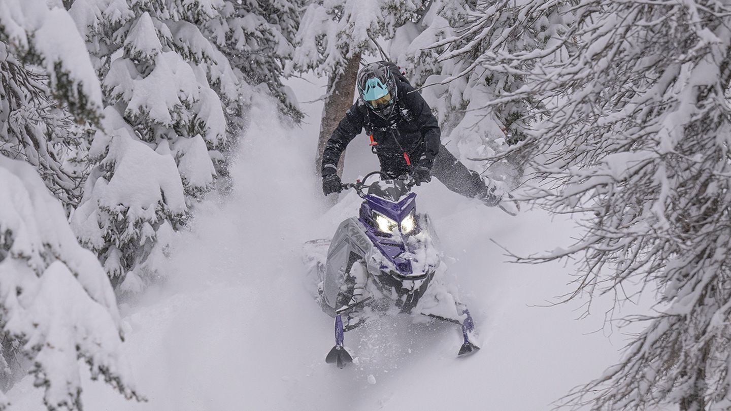 Avec la chenille de 155 pouces et son profil agressif, le PRO RMK Slash se place naturellement en neige profonde et permet de contrôler la motoneige par le transfert de poids, que ce soit pour tracer des lignes techniques entre les arbres ou pour grimper des couloirs plus ouverts.